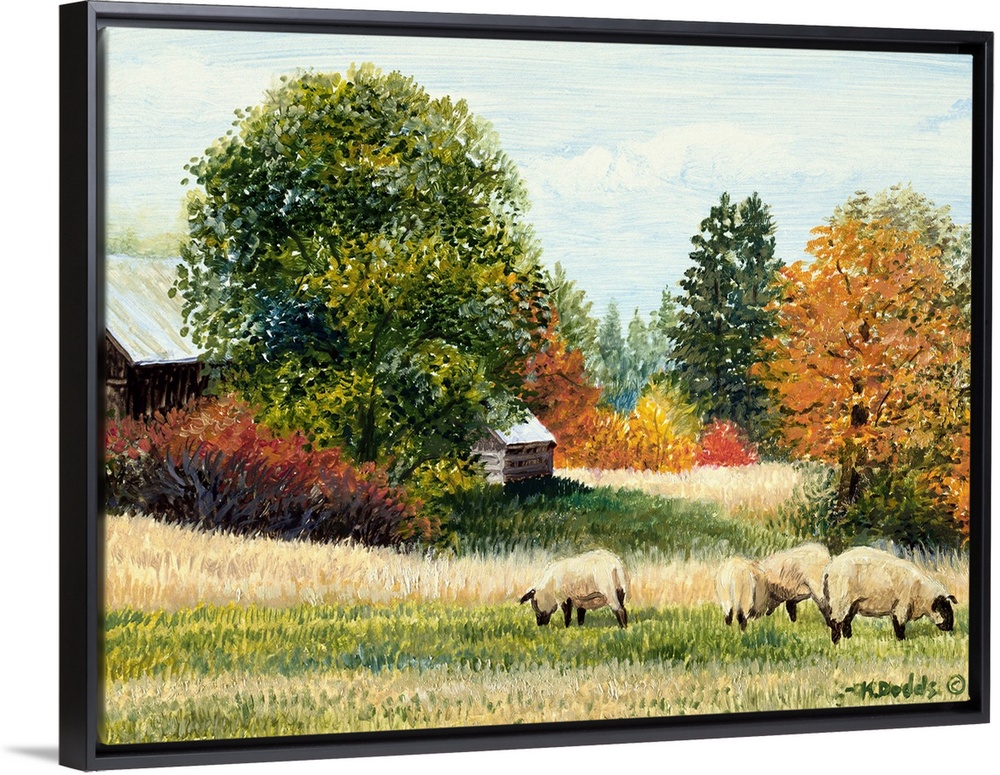 <p>Contemporary artwork of sheep in a field in the fall near a barn.</p>