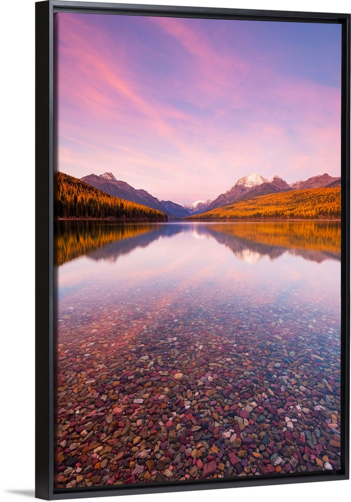 <p>Autumn colours at sunset on Bowman Lake, Glacier National Park, Montana, USA.</p>