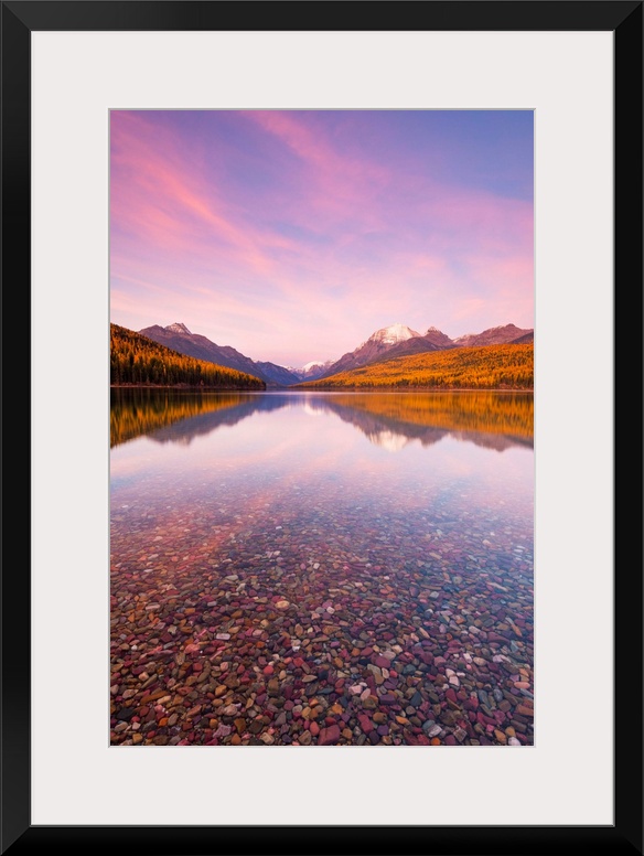 <p>Autumn colours at sunset on Bowman Lake, Glacier National Park, Montana, USA.</p>
