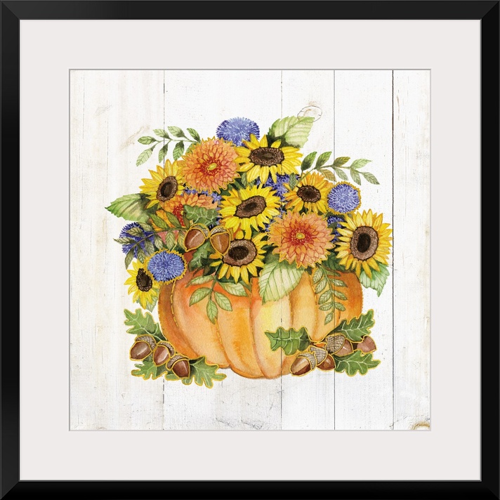 <p>A square Fall decorative piece with an arrangement of flowers and pumpkins on a white wood paneled background.</p>