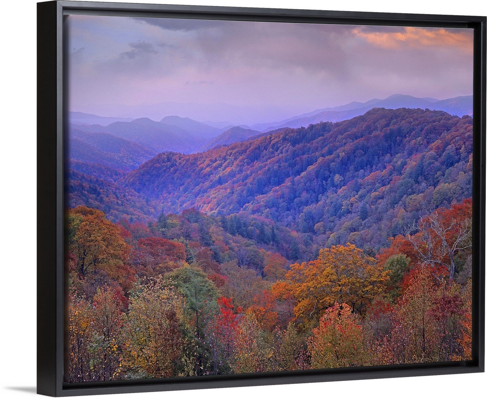 <p>Photo on canvas of mountains covered in fall foliage.</p>