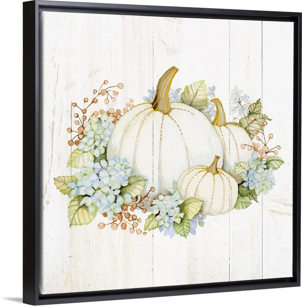 <p>A square Fall decorative piece with an arrangement of flowers and pumpkins on a white wood paneled background.</p>