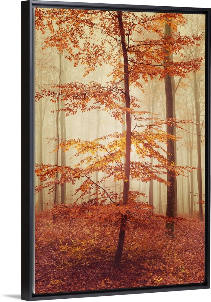 <p>Fine art photo of a misty forest of slender trees in fall colors.</p>