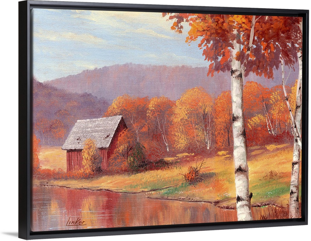 <p>Shack by pond in front of mountain range and autumn birch trees.</p>