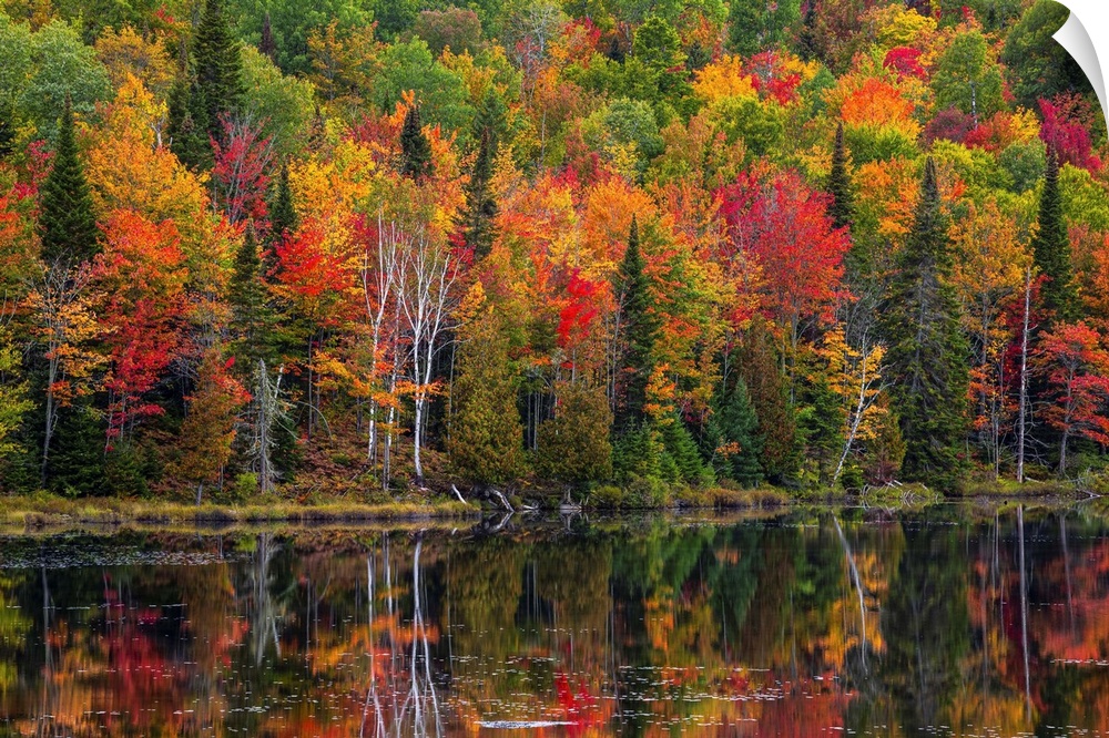 <p>Vibrant autumn coloured foliage in a forest along a tranquil lake reflecting the colours; Lac Labelle Region, Quebec, Canada</p>