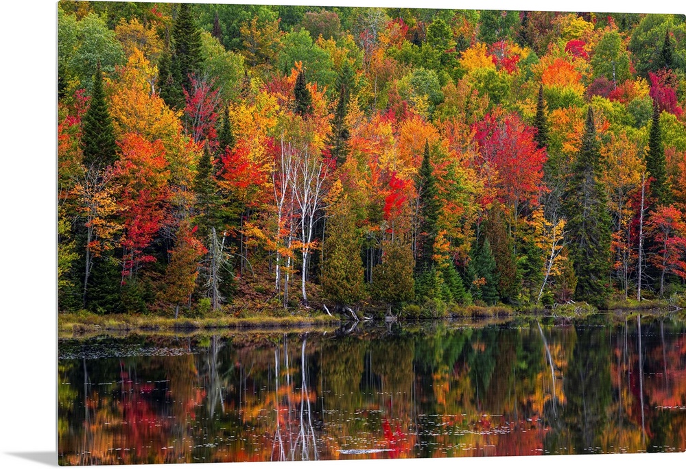 <p>Vibrant autumn coloured foliage in a forest along a tranquil lake reflecting the colours; Lac Labelle Region, Quebec, Canada</p>