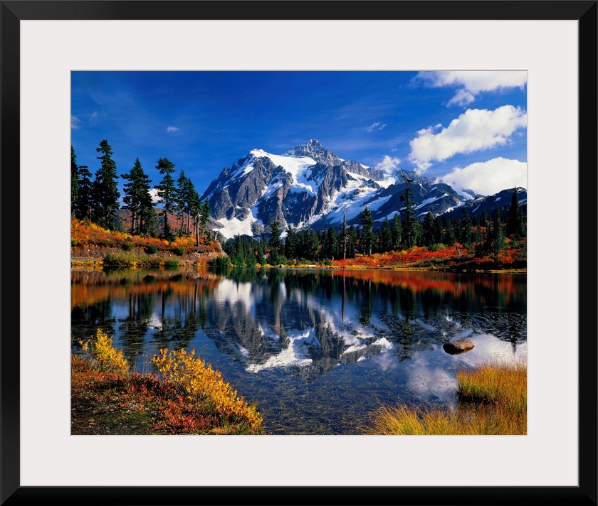 <p>Autumn foliage surrounding picture lake, mount Baker-Snoqualmie national forest in north cascades national park, Washington state, united states of America.</p>