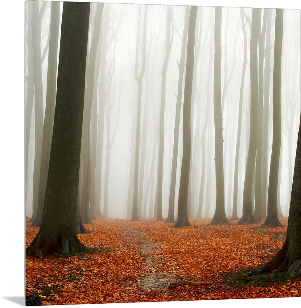 <p>A square photograph of a forest engulfed by a mist with a layer of leaves on the ground.</p>