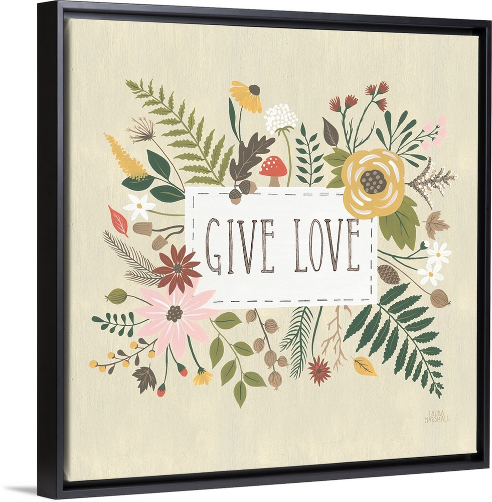 <p>"Give Love" written in a white rectangle on a light tan background, surrounded by Autumn flowers.</p>