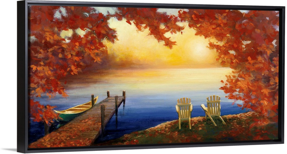 <p>Contemporary painting of adirondack chairs overlooking a lake with a pier.</p>