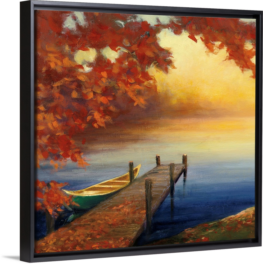 <p>Contemporary artwork of a small pier with a boat in a lake with fall leaves.</p>