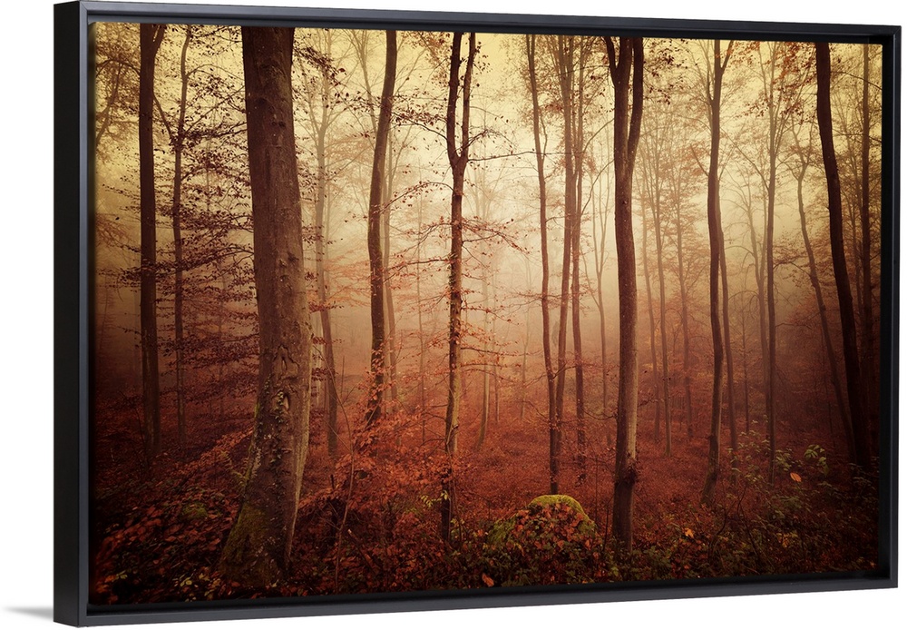 <p>Fine art photo of a misty forest of slender trees in fall colors.</p>