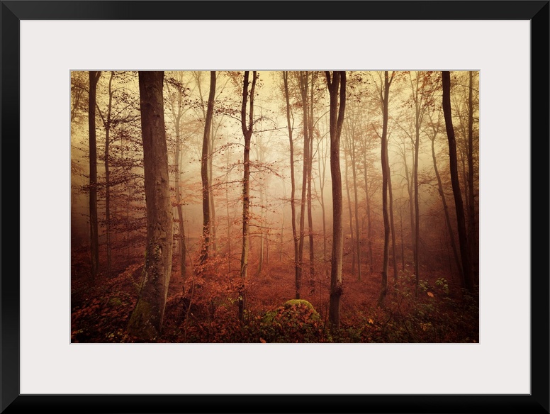 <p>Fine art photo of a misty forest of slender trees in fall colors.</p>