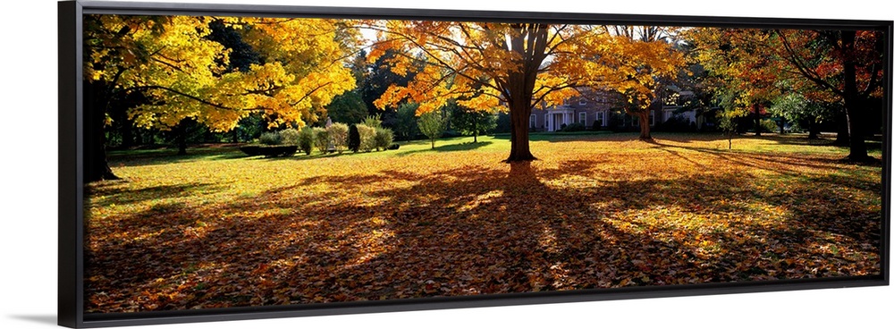 <p>Trees in autumn are photographed panoramically as their leaves have fallen and blanketed the ground.</p>