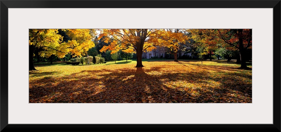 <p>Trees in autumn are photographed panoramically as their leaves have fallen and blanketed the ground.</p>