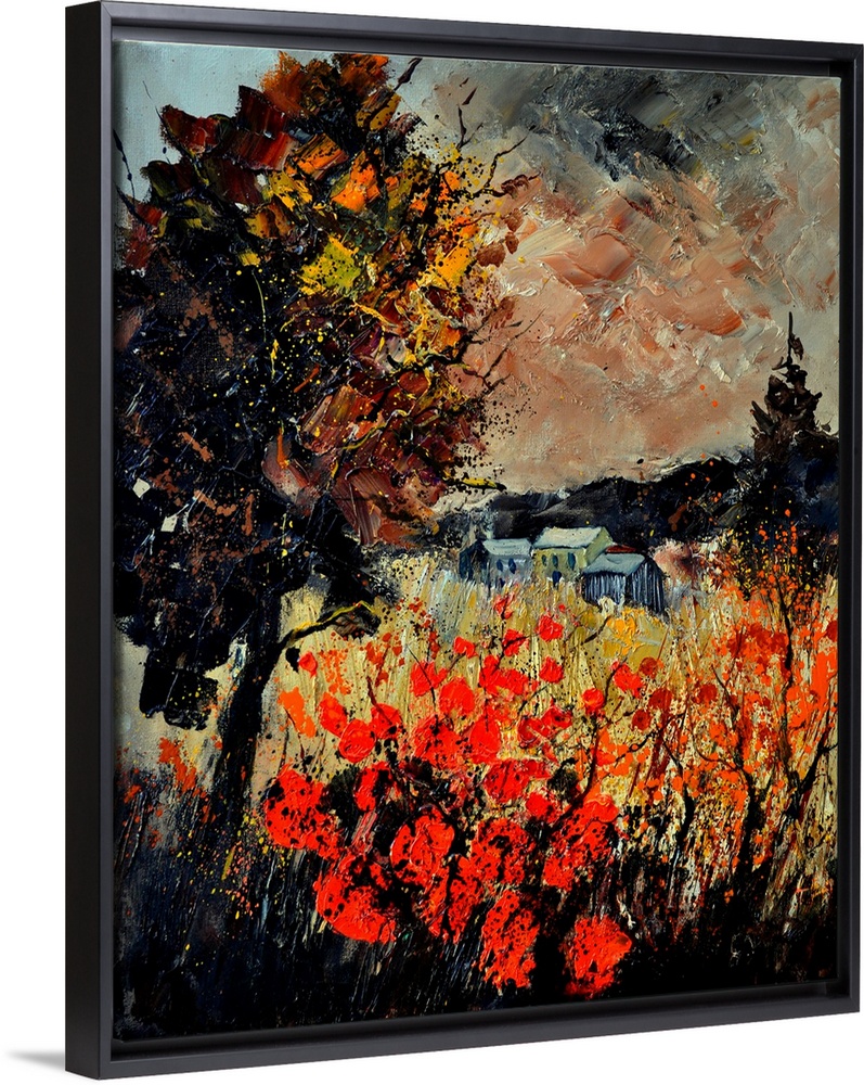 <p>An autumn scene of red blooming flowers in a field near a small village.</p>