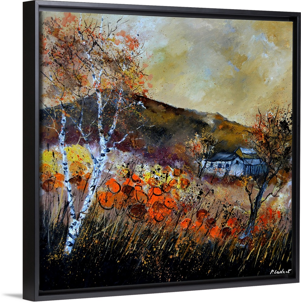 <p>Square painting of an Autumn landscape with orange and yellow flowers in the foreground and a Belgium village in the background with rolling hills in the distance.</p>