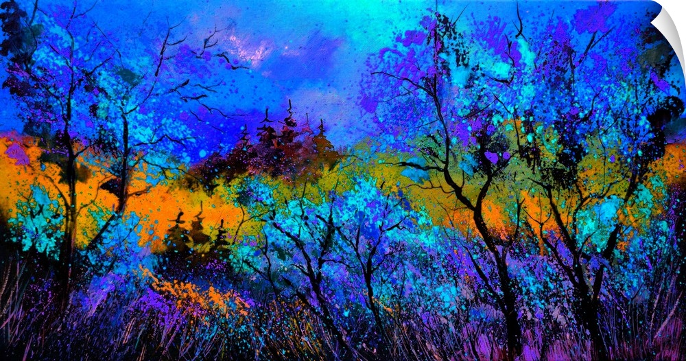 <p>Horizontal painting landscape of blue trees in the foreground and a bright warm sky in the background.</p>