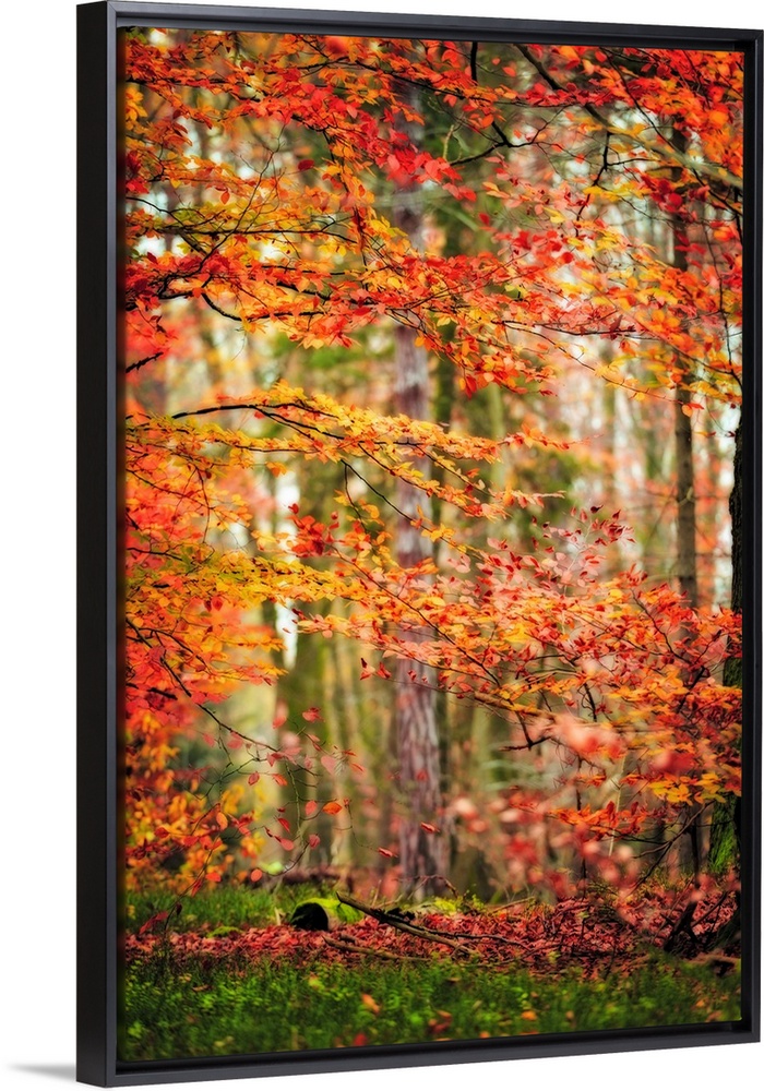 <p>Fine art photo of a forest with orange and red leaves in the fall.</p>