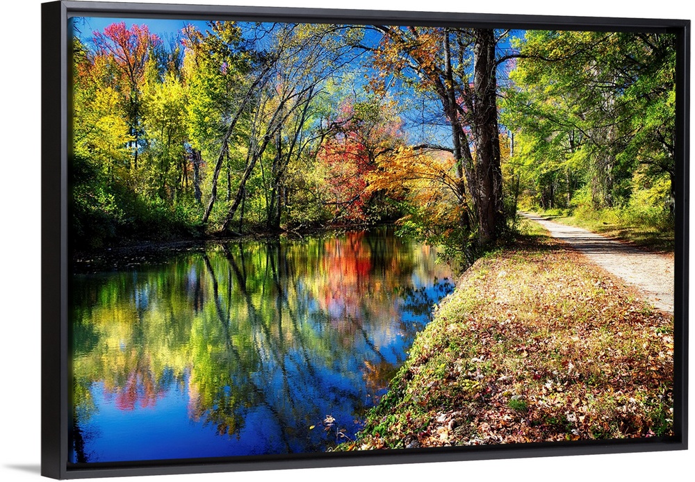 <p>Path along a river in a forest in the fall in Princeton, New Jersey.</p>