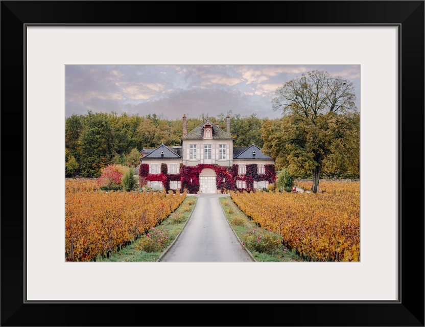 <p>Bourgogne wine region (Burgundy), France, Europe. Autumn landscape, vineyards and luxury house.</p>
