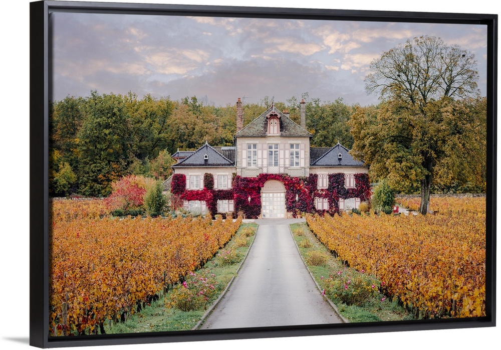 <p>Bourgogne wine region (Burgundy), France, Europe. Autumn landscape, vineyards and luxury house.</p>