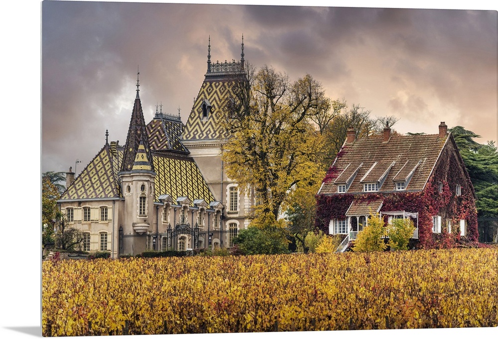 <p>Bourgogne wine region (Burgundy), France, Europe. Autumn landscape, vineyards luxury houses and castle</p>
