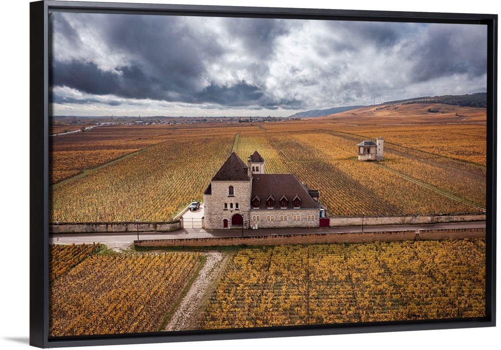 <p>Bourgogne wine region (Burgundy), France, Europe. Autumn landscape, vineyards and Castle from above</p>