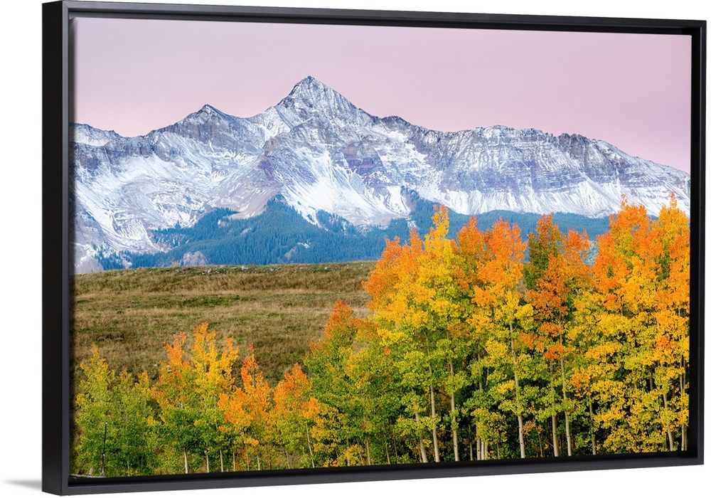 <p>Beautiful, bright landscape photograph of colorful Fall trees in the foreground, snowy mountains in the background, and a pink sky above.</p>