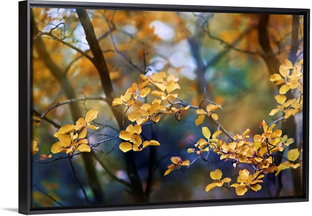 <p>Tranquil artistic photograph of a branch with many small golden leaves with thin trees in soft focus in the background.</p>
