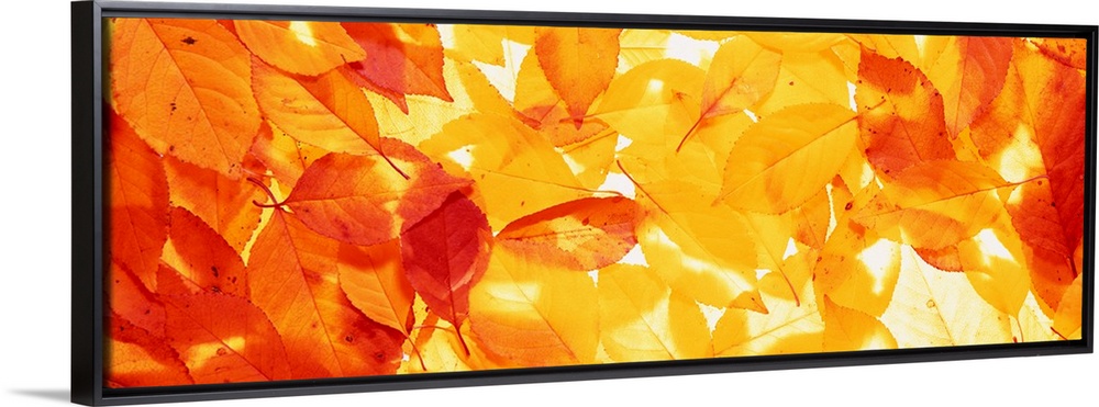 <p>Fall colored leaves are scattered about and photographed in a wide angle view with sun spots hitting some of the leaves.</p>