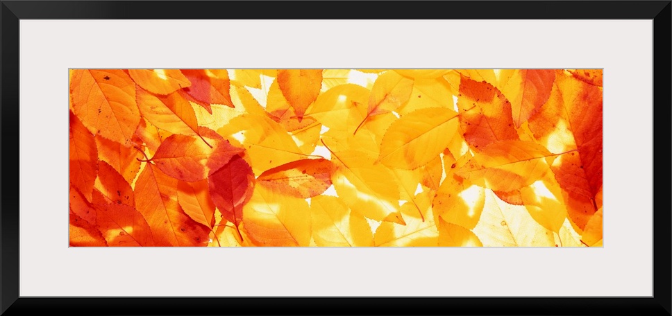 <p>Fall colored leaves are scattered about and photographed in a wide angle view with sun spots hitting some of the leaves.</p>