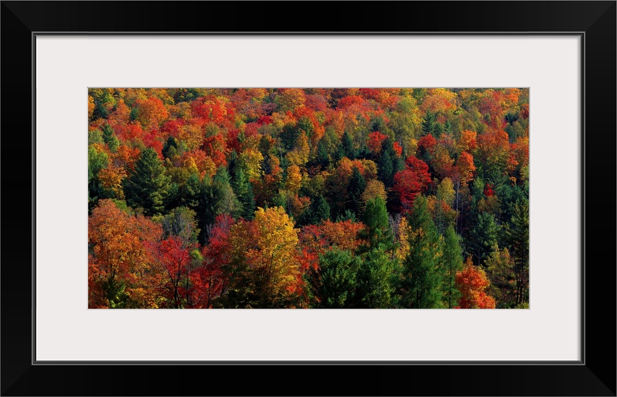 <p>Panoramic photograph taken from an aerial view overlooks a densely filled forest packed with trees displaying their Fall colors.</p>