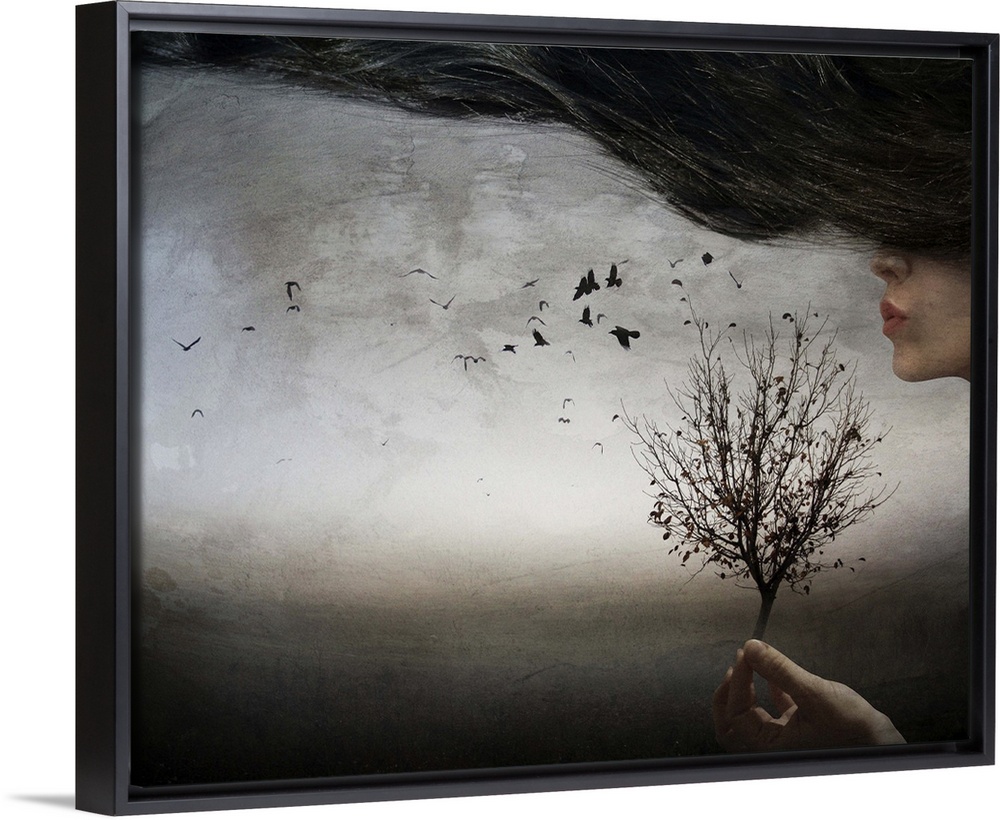 <p>Conceptual image of a woman with long hair holding a tree and blowing through the branches.</p>