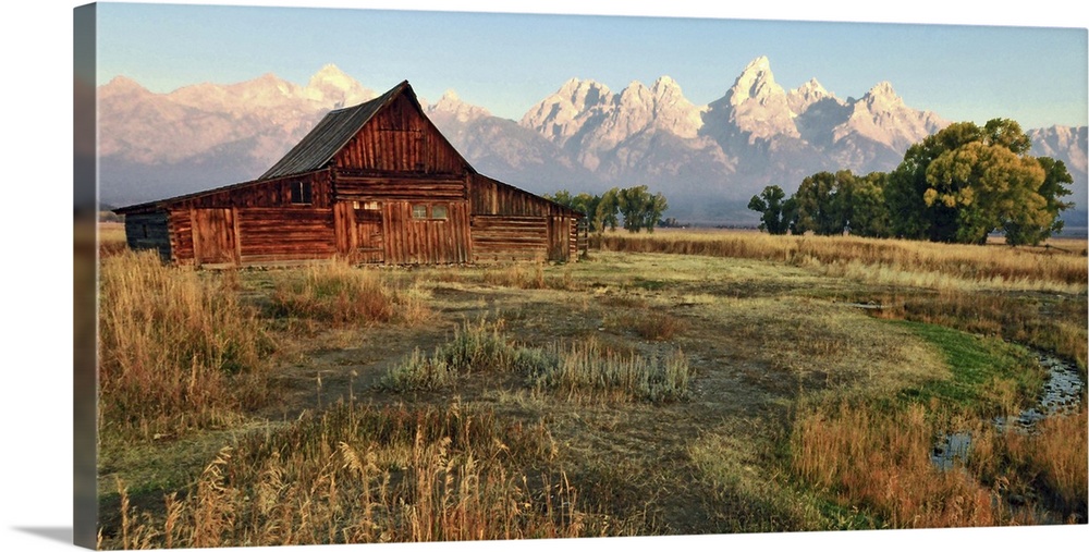 <p>An old rural barn inside Grand Teton National Park in Jackson Hole, Wyoming in front of Teton mountain range.</p>