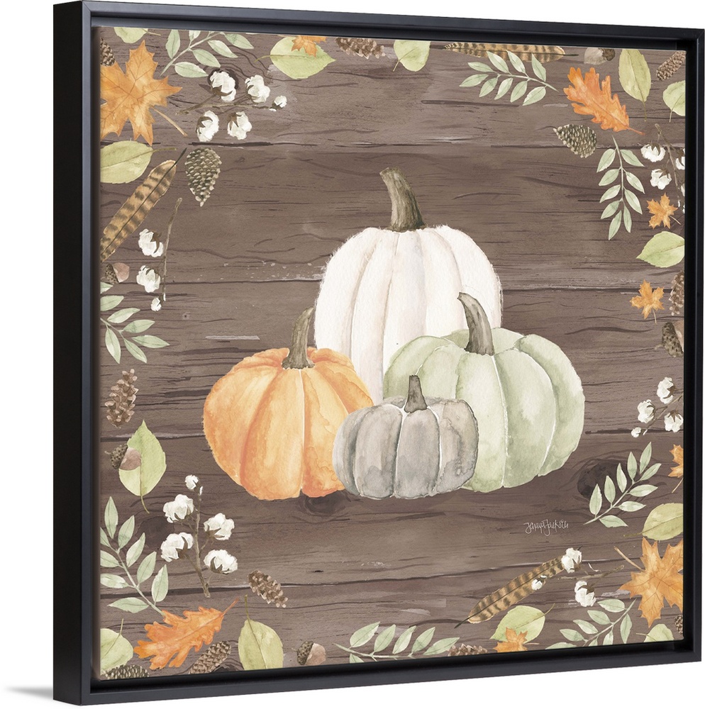 <p>Decorative artwork of fall leaves framing a group of pumpkins and a brown wood background.</p>