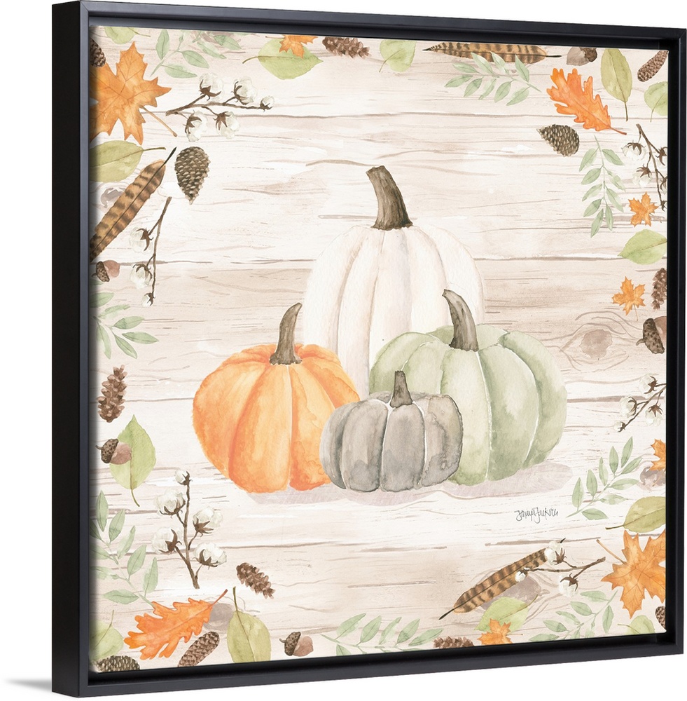 <p>Decorative artwork of fall leaves framing a group of pumpkins and a white wood background.</p>