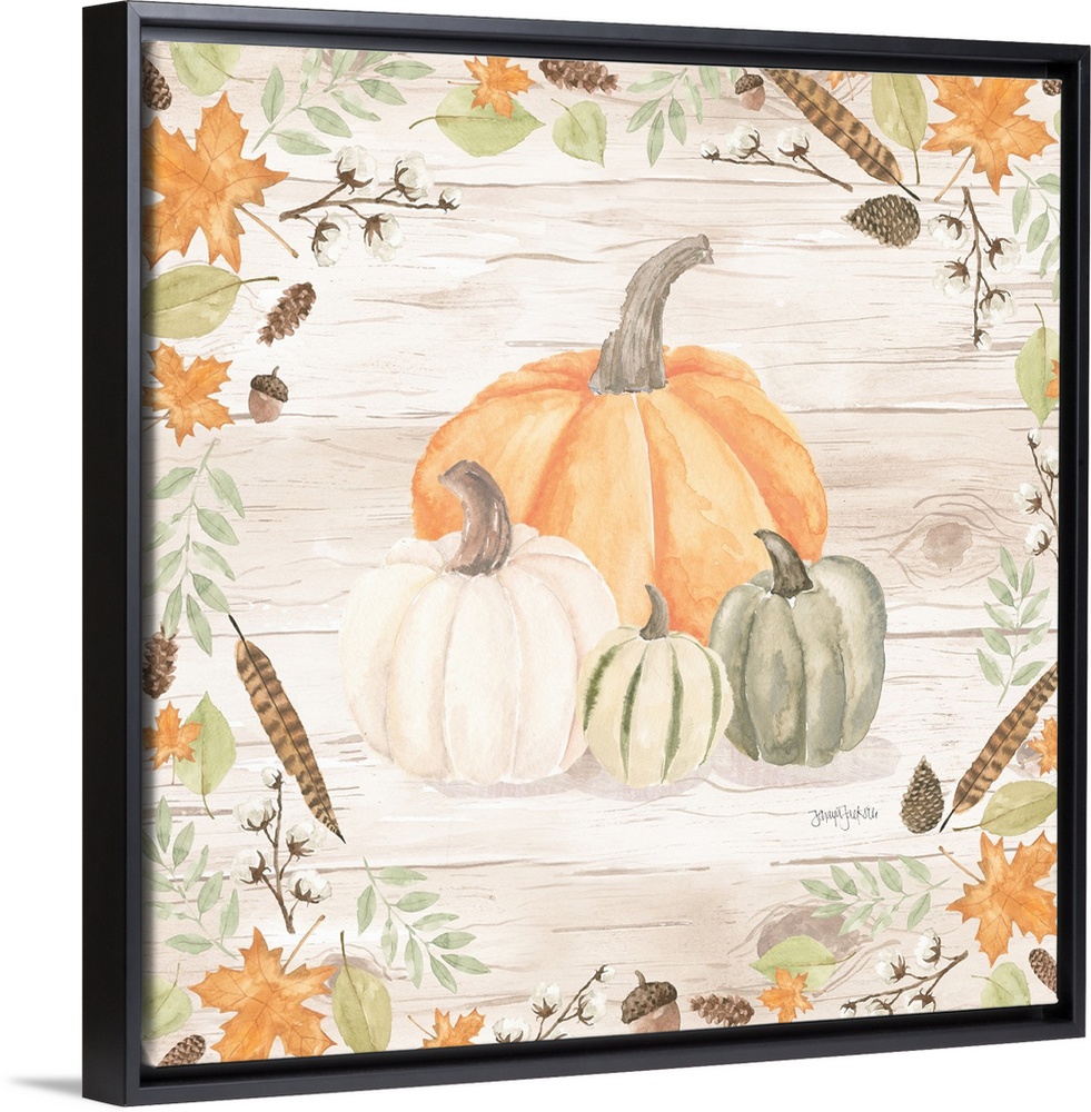 <p>Decorative artwork of fall leaves framing a group of pumpkins and a white wood background.</p>