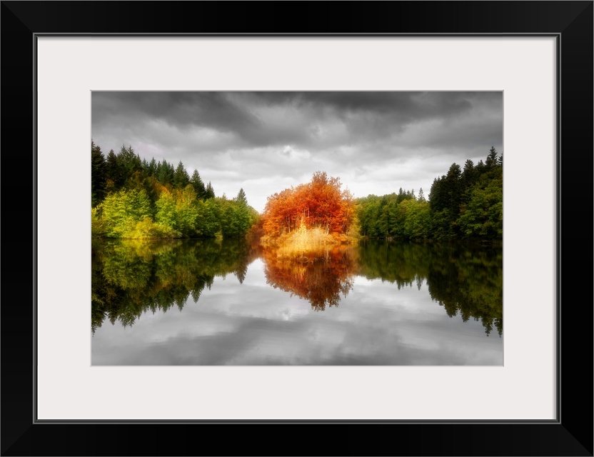 <p>A group of orange trees at the edge of a lake standing out against the green forest.</p>