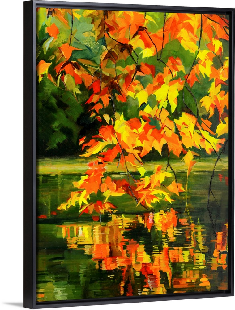 <p>Leaves in fall haning over water.</p>
