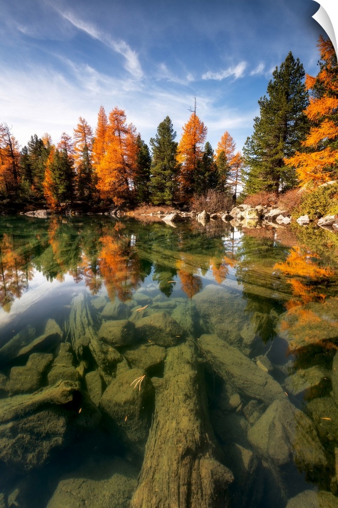 <p>Autumn reflections at Saoseo Lake, Poschiavo Valley, Canton of Graubuenden Switzerland, Europe</p>