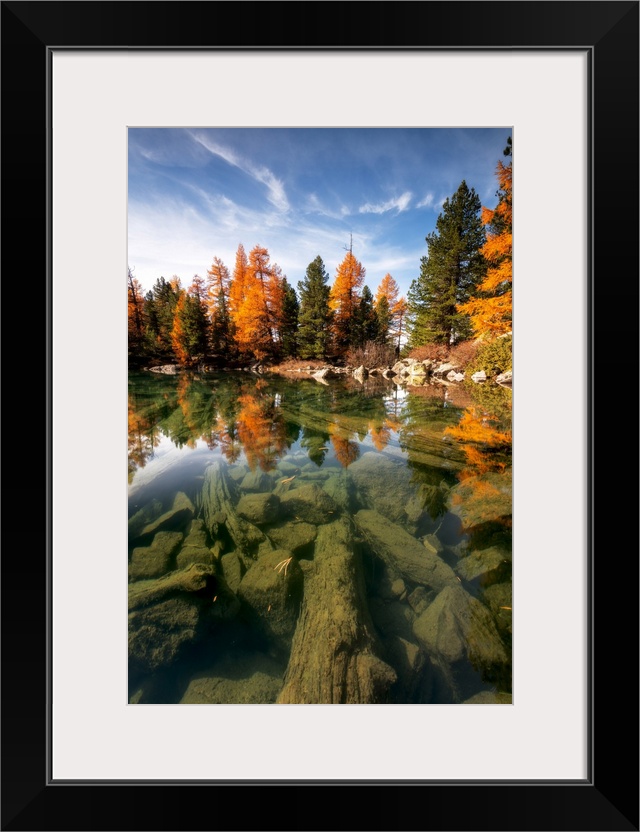 <p>Autumn reflections at Saoseo Lake, Poschiavo Valley, Canton of Graubuenden Switzerland, Europe</p>