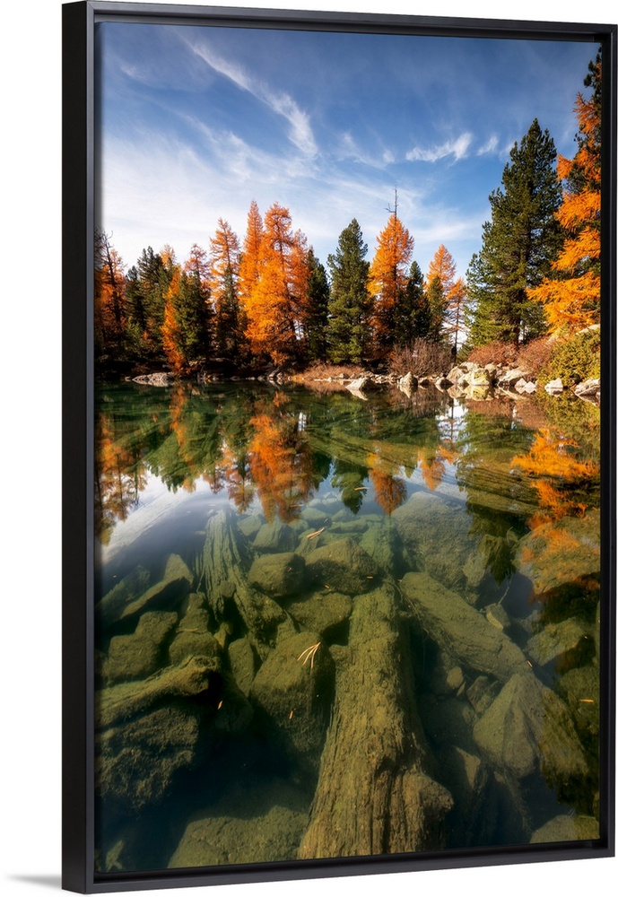 <p>Autumn reflections at Saoseo Lake, Poschiavo Valley, Canton of Graubuenden Switzerland, Europe</p>