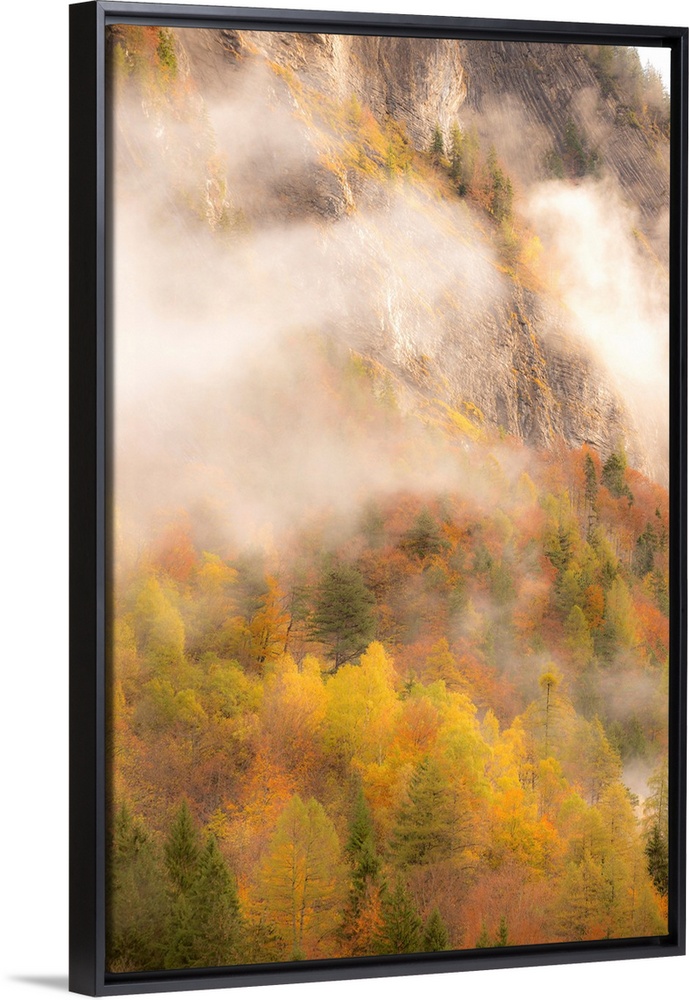 <p>Landscape photograph of colorful Autumn trees under foggy mountain rock cliffs.</p>
