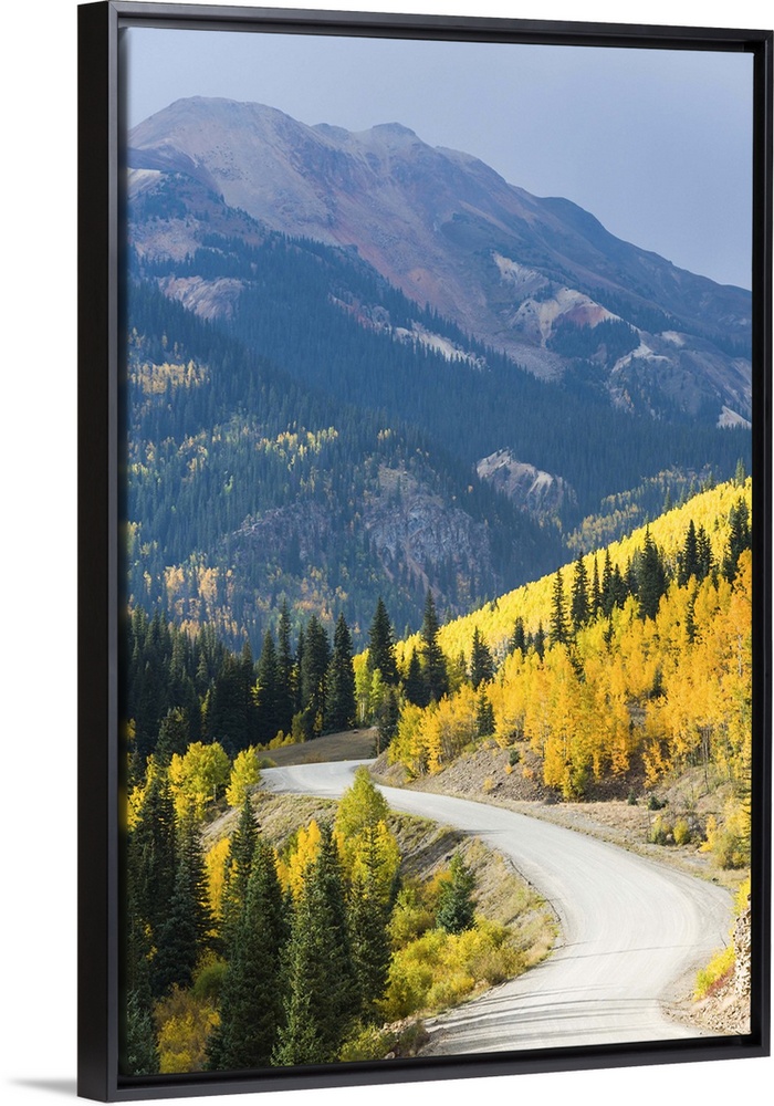 <p>A wilderness road leading to an autumn storm that is approaching mountains with brilliant fall color aspen trees. The Colorado Rocky Mountains, September.</p>