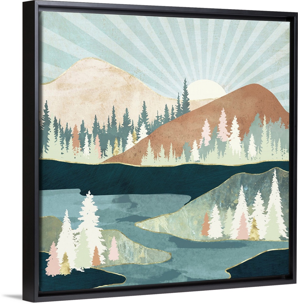 <p>Abstract landscape depicting an autumn sun with mountains, trees, water, blue, green, pink, brown, and gold.</p>