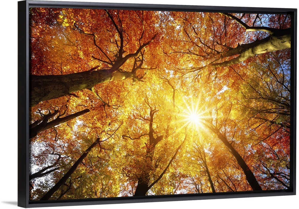 <p>Worm's eye view of the autumn sun warmly shining through the canopy of beech trees with gold foliage.</p>