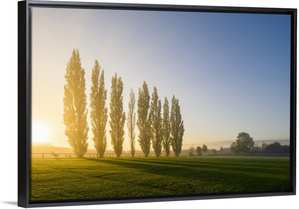 <p>Autumn sunrise behind a row of Lombardy Poplar trees at the recreation ground in the North Somerset village of Wrington.</p>