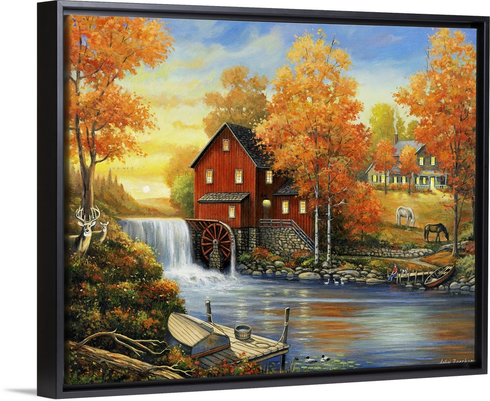 <p>A house with a large red barn and water wheel with a brook and a dock with a row boat and two deer standing in the flowers.autumn, fall, trees</p>