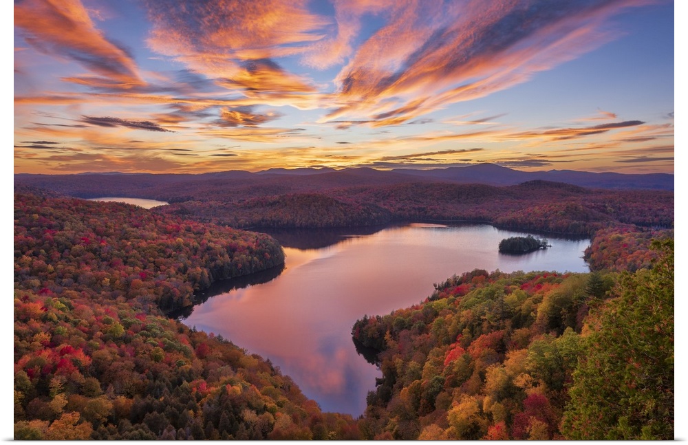 <p>Autumn sunset over Nichols Pond, Green Mountains, Woodbury, Vermont, USA.</p>